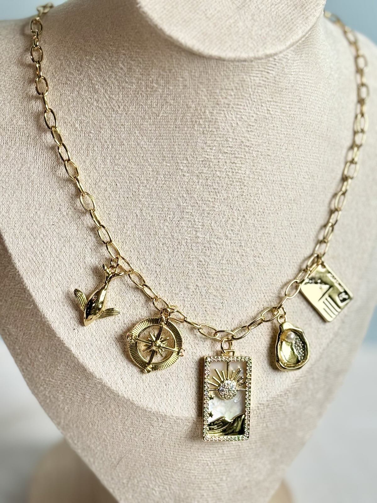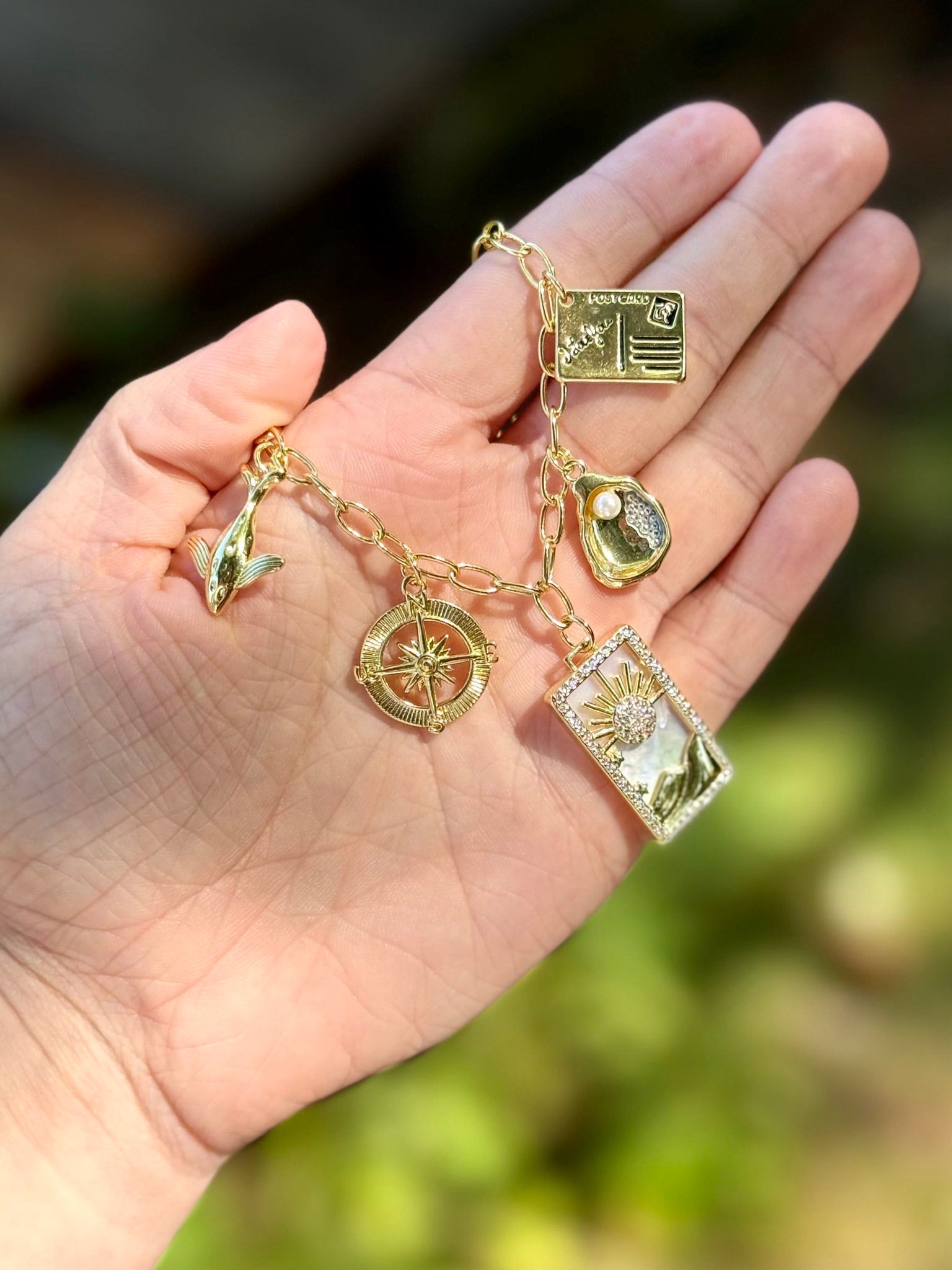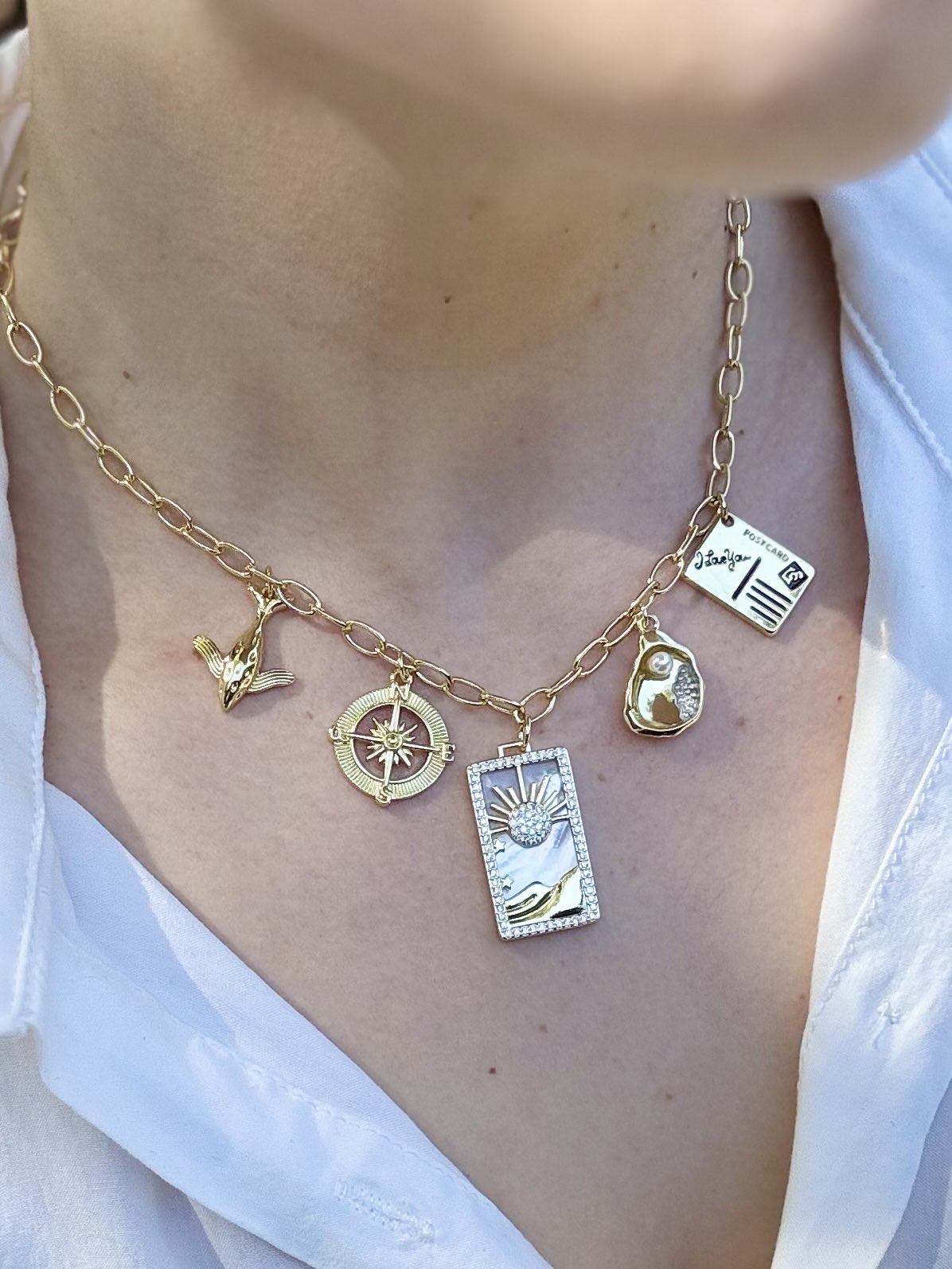 This gold-filled charm necklace is an ode to the Pacific Northwest - featuring a whale, oyster with a tiny pearl, a post card, compass, and a mountain charm with mother of pearl backing. All on a gorgeous gold-filled chain!