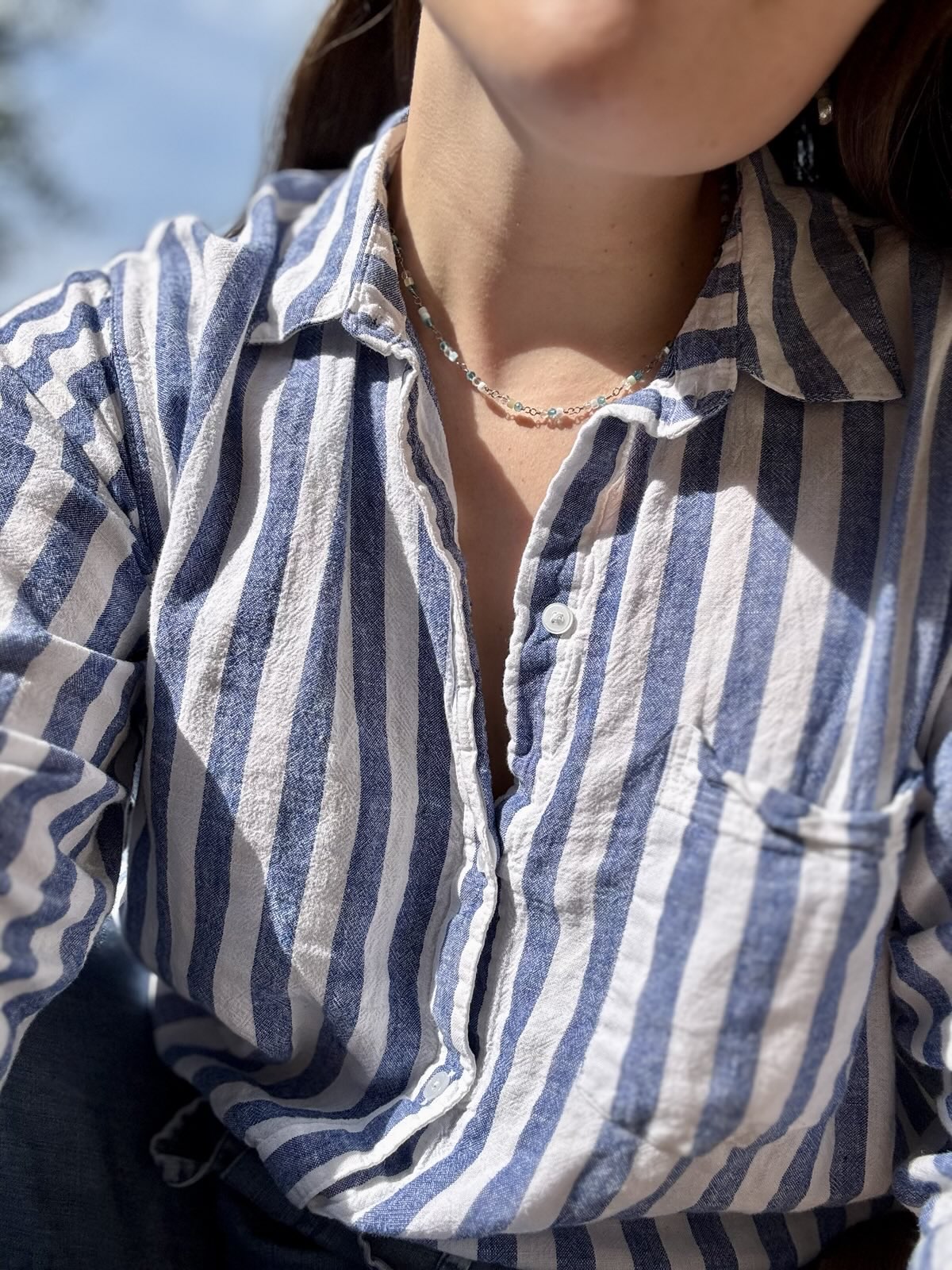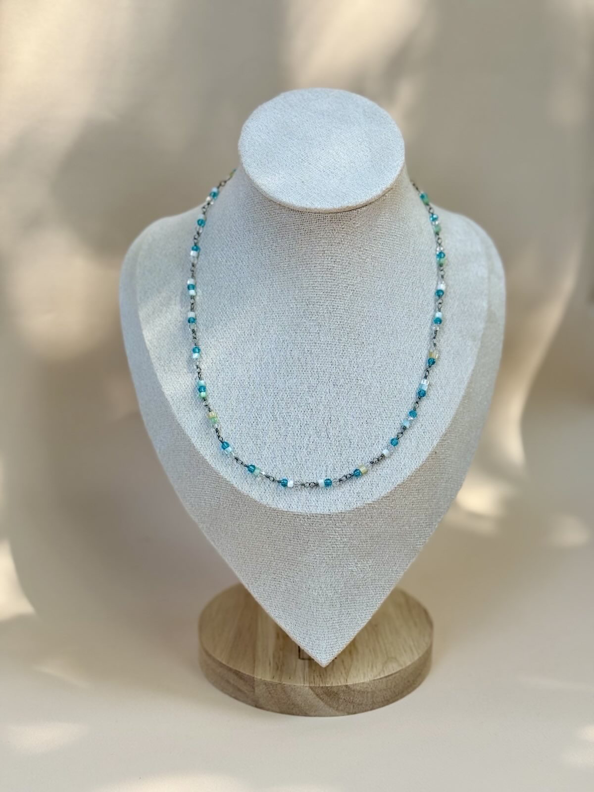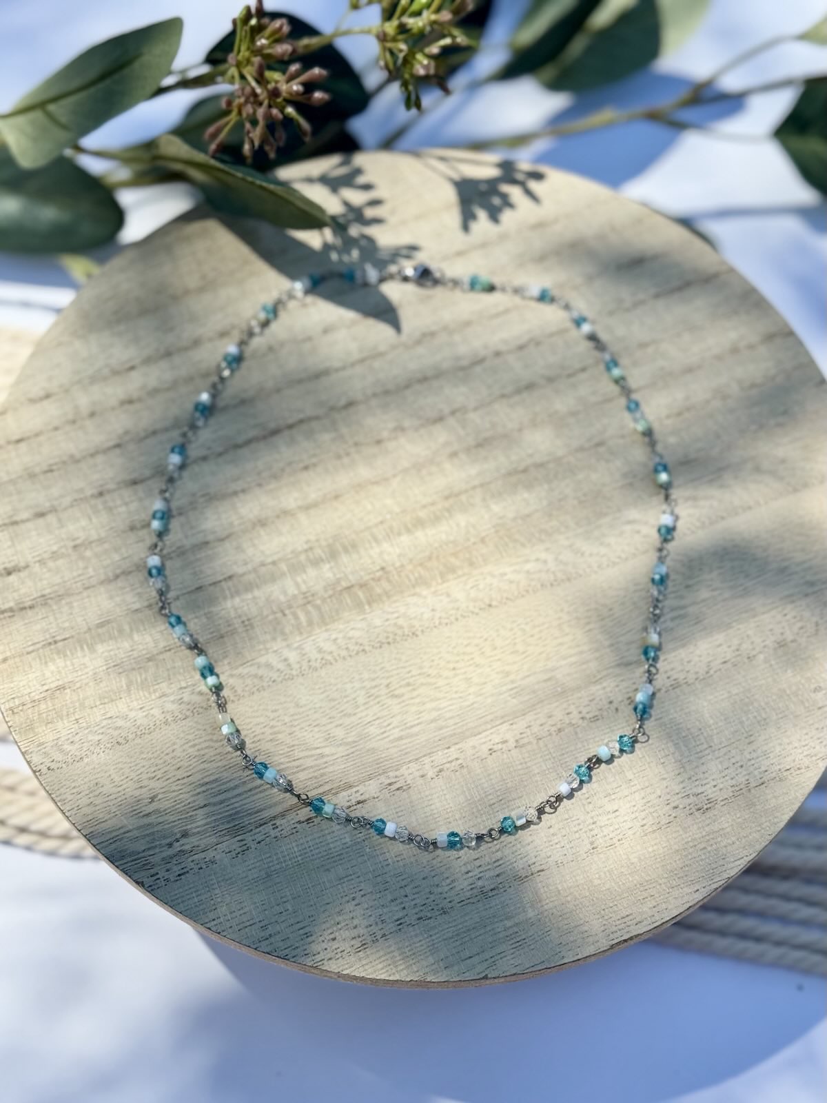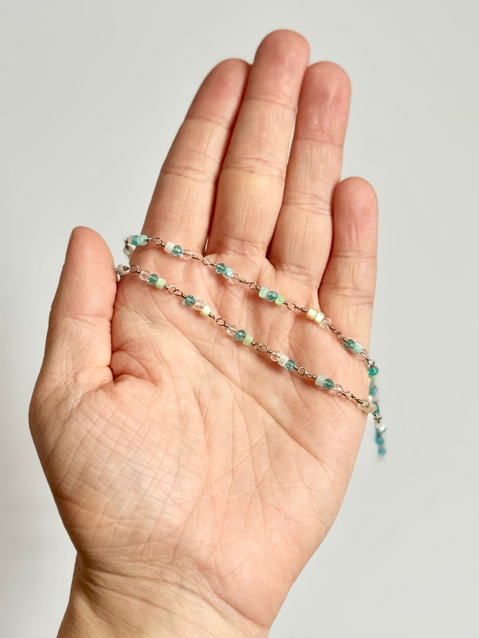 Beautiful interlocking beaded chain choker necklace featuring mother of pearl and crystal glass beads - choose from three lengths, 14, 15, or 16 inches. Due to the nature of the way these chains are wrapped, lengths may be closer to 14.25-16.25 inches.
