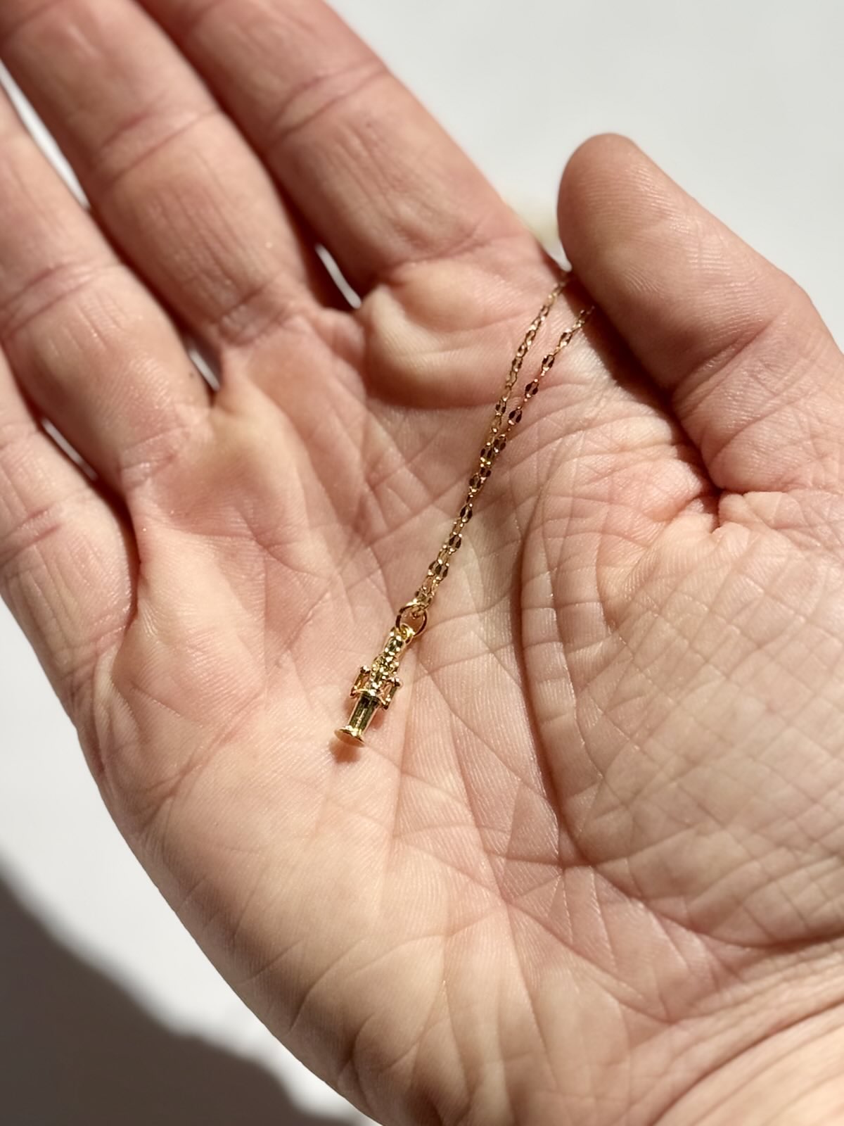 Necklace is made of gold-plated brass and 16 inches in length with a 2 inch extender.
