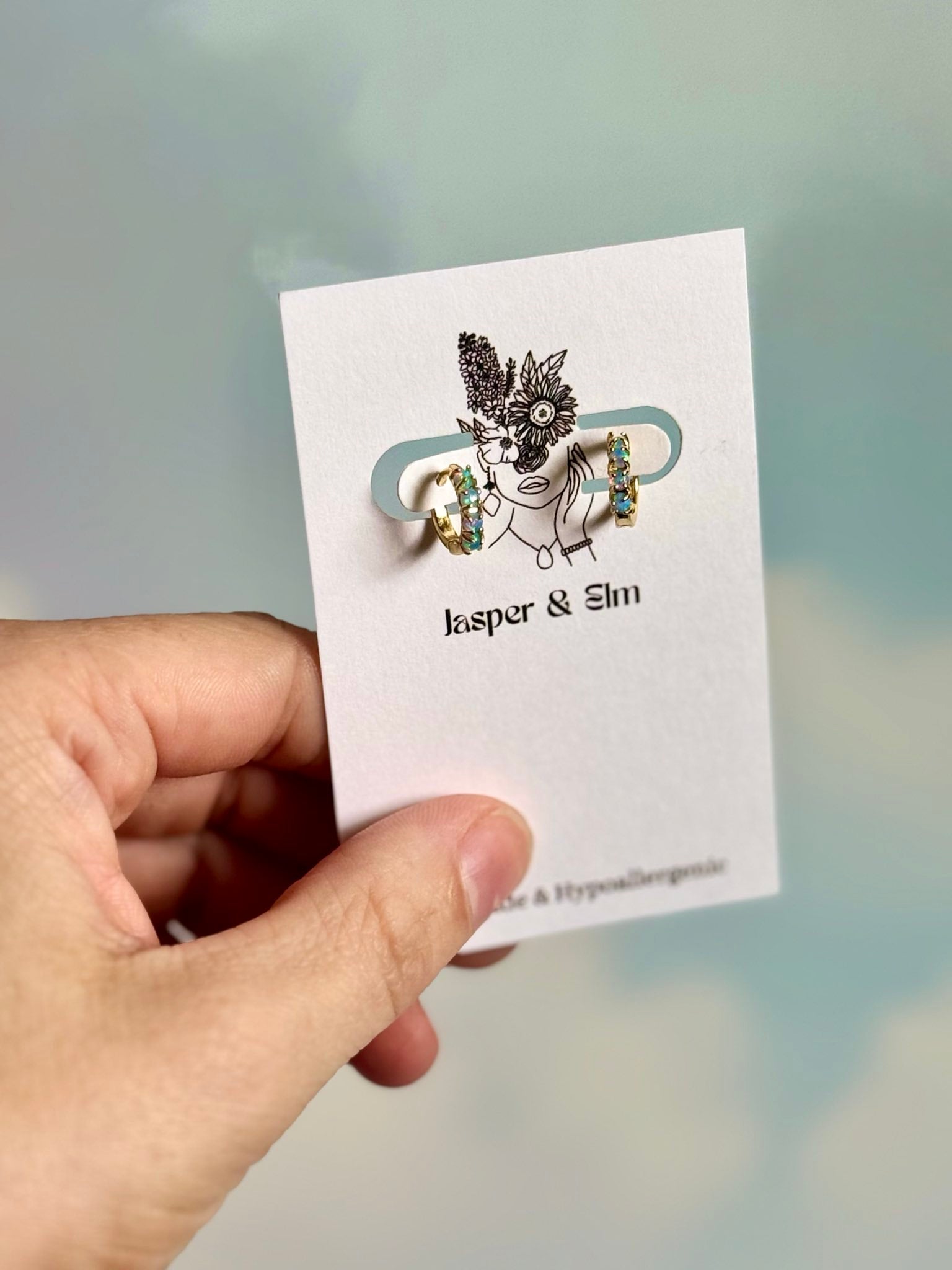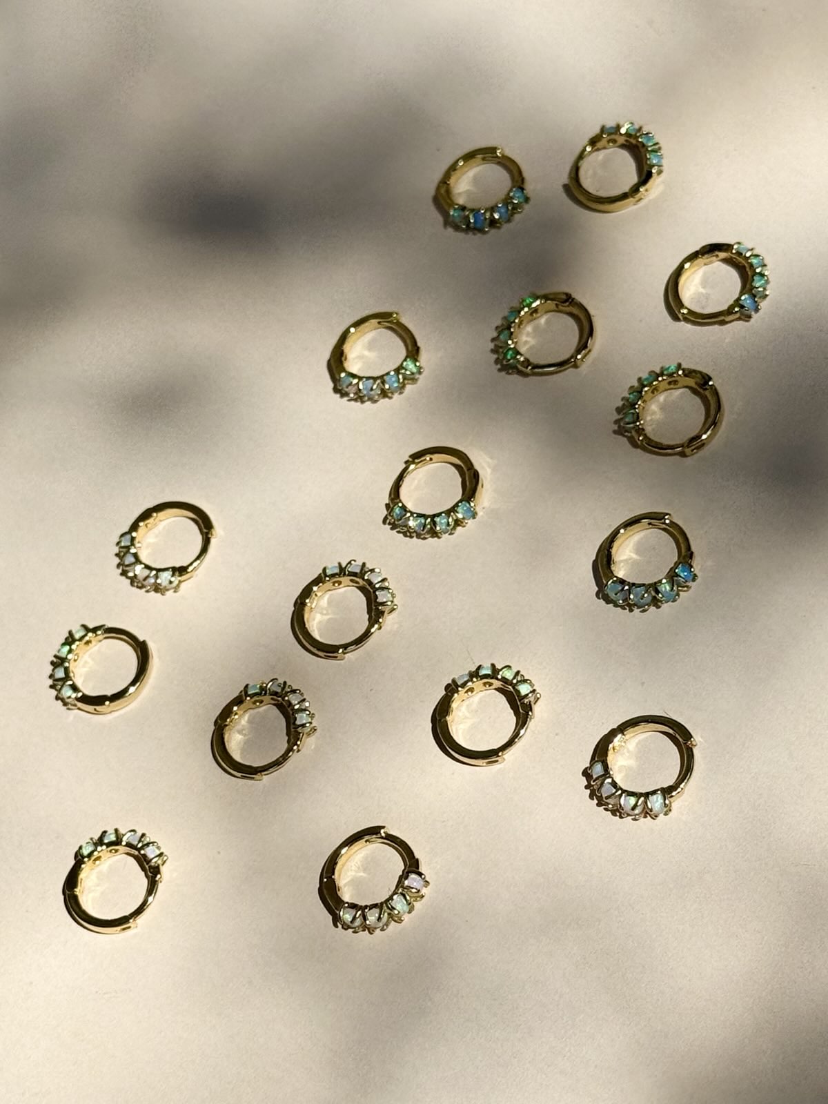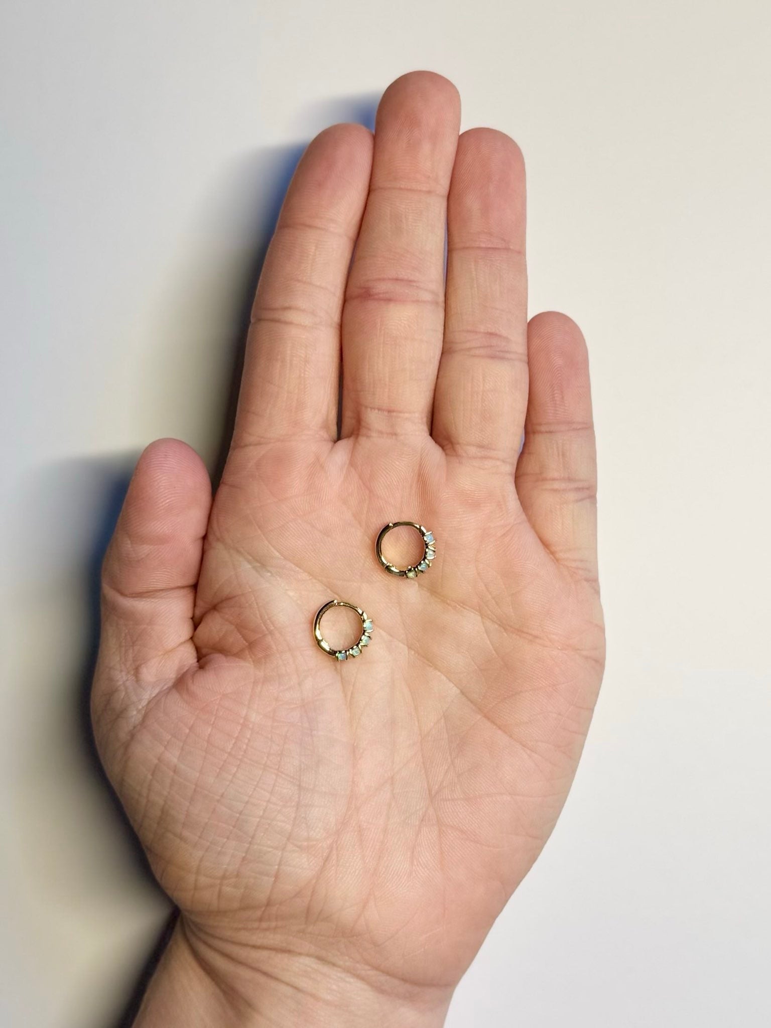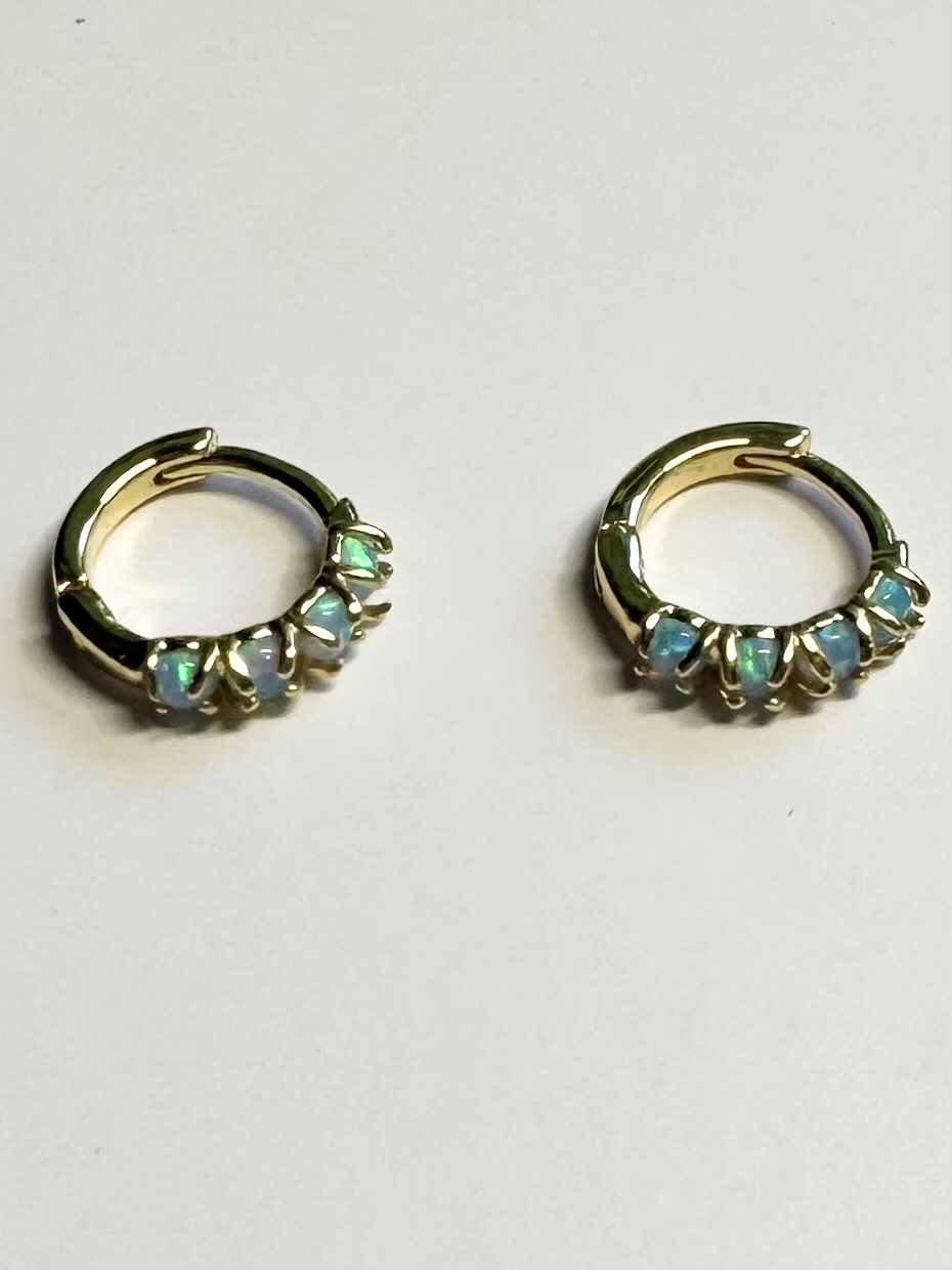 Beautiful lab-created opals in blue or white on a gold-plated brass hoop. Dainty and sparkly, perfect for everyday wear.
